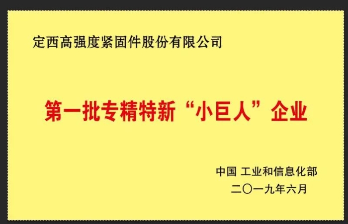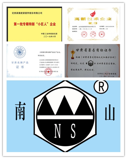 公司是国家工信部第一批专精特新“小巨人”企业、高新技术企业、中国机械通用零部件工业协会紧固件分会常务理事、中国机械零部件产业技术创新联盟理事单位、全国紧固件标准化技术委员会单位委员、甘肃省专精特新企业,公司已通过ISO 9001、ISO 14001和ISO 45001三体系认证,产品取得欧盟CE认证。定西高强实验室已被国家CNAS实验室认可,且被评为“甘肃省紧固件工程实验室”,企业技术中心、设计中心分别被认定为“省级企业技术中心”、“省级工业设计中心”。公司的“南山”牌紧固件为“甘肃名牌产品”,“南山”牌商标为“甘肃省著名商标”。