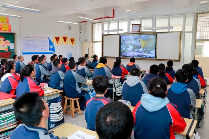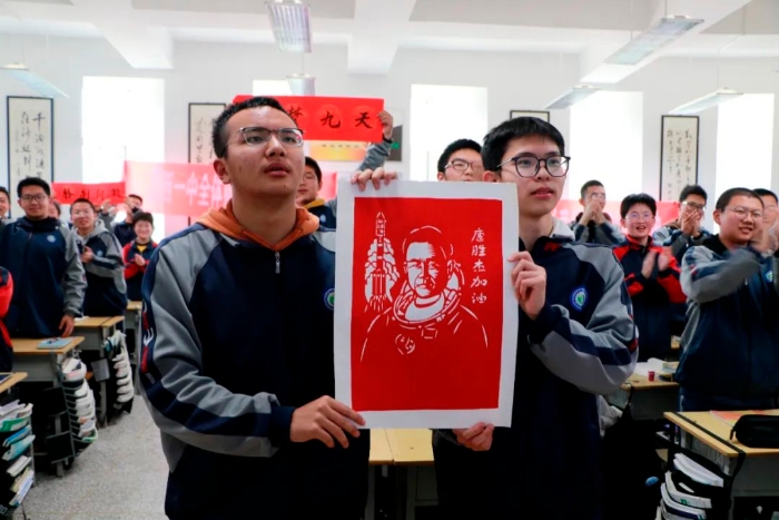 作为定西一中的杰出校友,这两天唐胜杰成为了母校师生们的焦点话题。十一时许,全校师生们在各班教室通过观看电视直播共同见证了神舟十七号载人飞船成功发射的历史性时刻,接受了一堂生动的爱国主义教育课。看着飞船发射成功,顺利进入预定轨道,教学楼内多次响起欢呼声和掌声,学弟学妹们高举“学长加油”“圆梦九天”的标语和出自教师之手的唐胜杰肖像剪纸画,争先恐后表达对唐胜杰学长的敬佩之情。